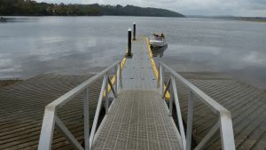 Dual lane concrete boat ramp with central pontoon platform