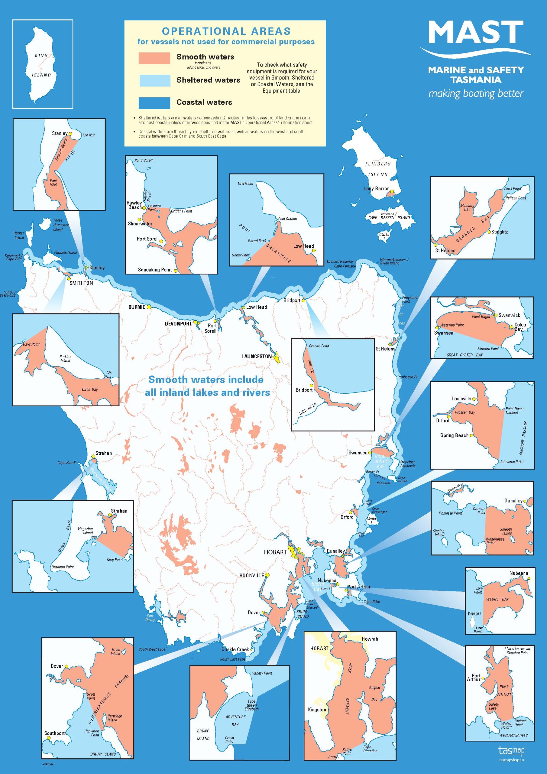 The required safety equipment varies according to the length of the vessel and the operational area. The Operation Area Map shows Smooth Waters, Sheltered Waters and Coastal Waters